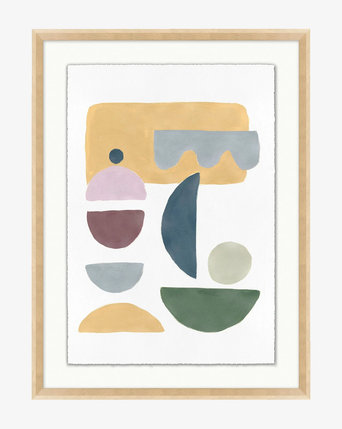 In a composition that embraces shape and tone, Abstract Shapes II brings intriguing brightness to artwork in the home. Colorful objects are playfully arranged throughout the piece, lending a whimsical yet sophisticated element to your decor. A giclee print on watercolor paper within a blond maple frame, this abstract piece is presented with gallery-quality materials.