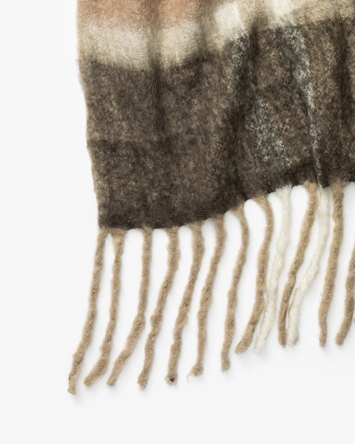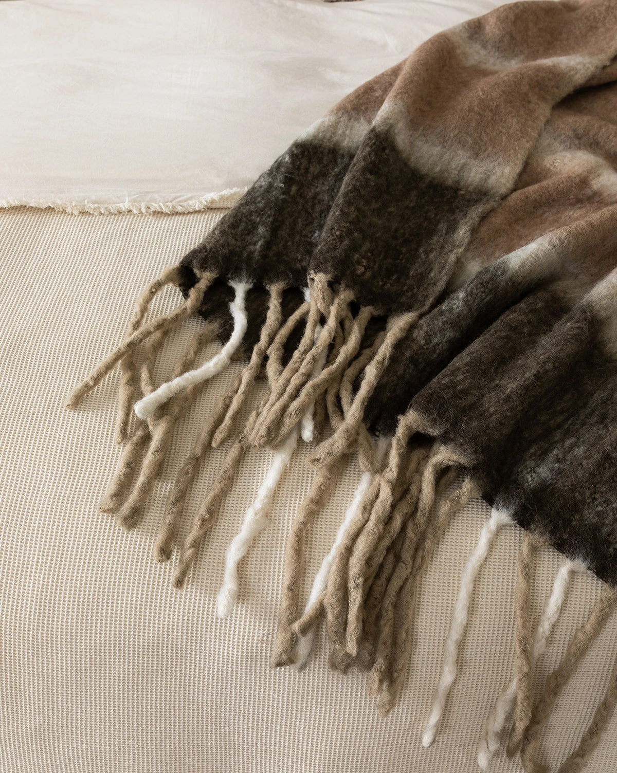 With several neutral tones and a thick fringe, the Allerton Plaid Throw is cozy and versatile. The throw is also textural, making it perfect for layering with bedding or for styling on a sofa or ottoman in the colder months.