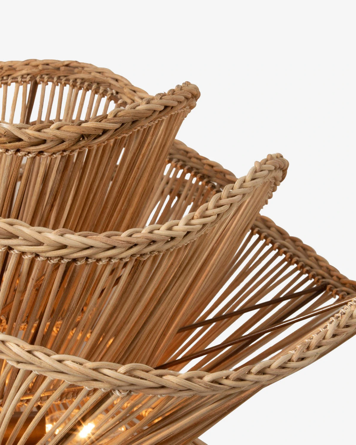 A sculptural nod to natural materials, the Alondra Chandelier is a statement-making centerpiece. Its abstract design is inspired by the lacy nature of graceful flower petals, creating an organic feel that layers and flows from one tier to the next. The edges are densely braided from rattan, connecting the intentionally placed reeds of the same material. Available in three finishes and a variety of sizes, this piece brings nature into the home.