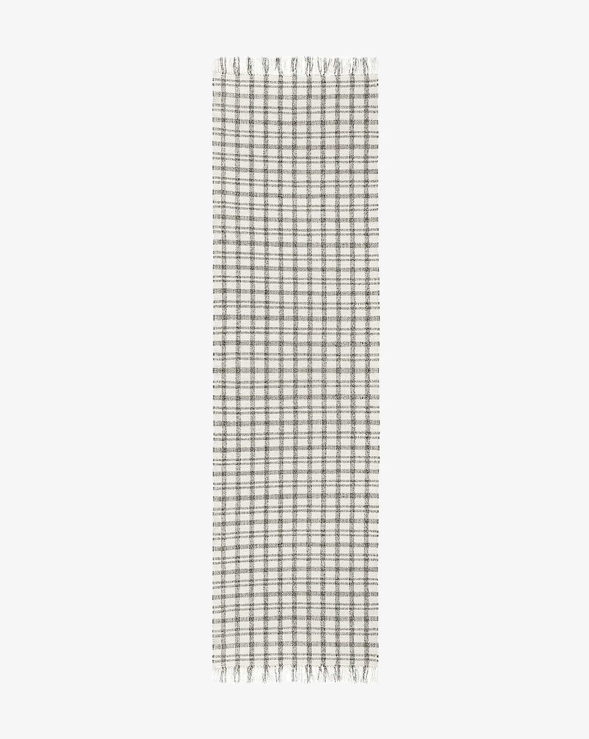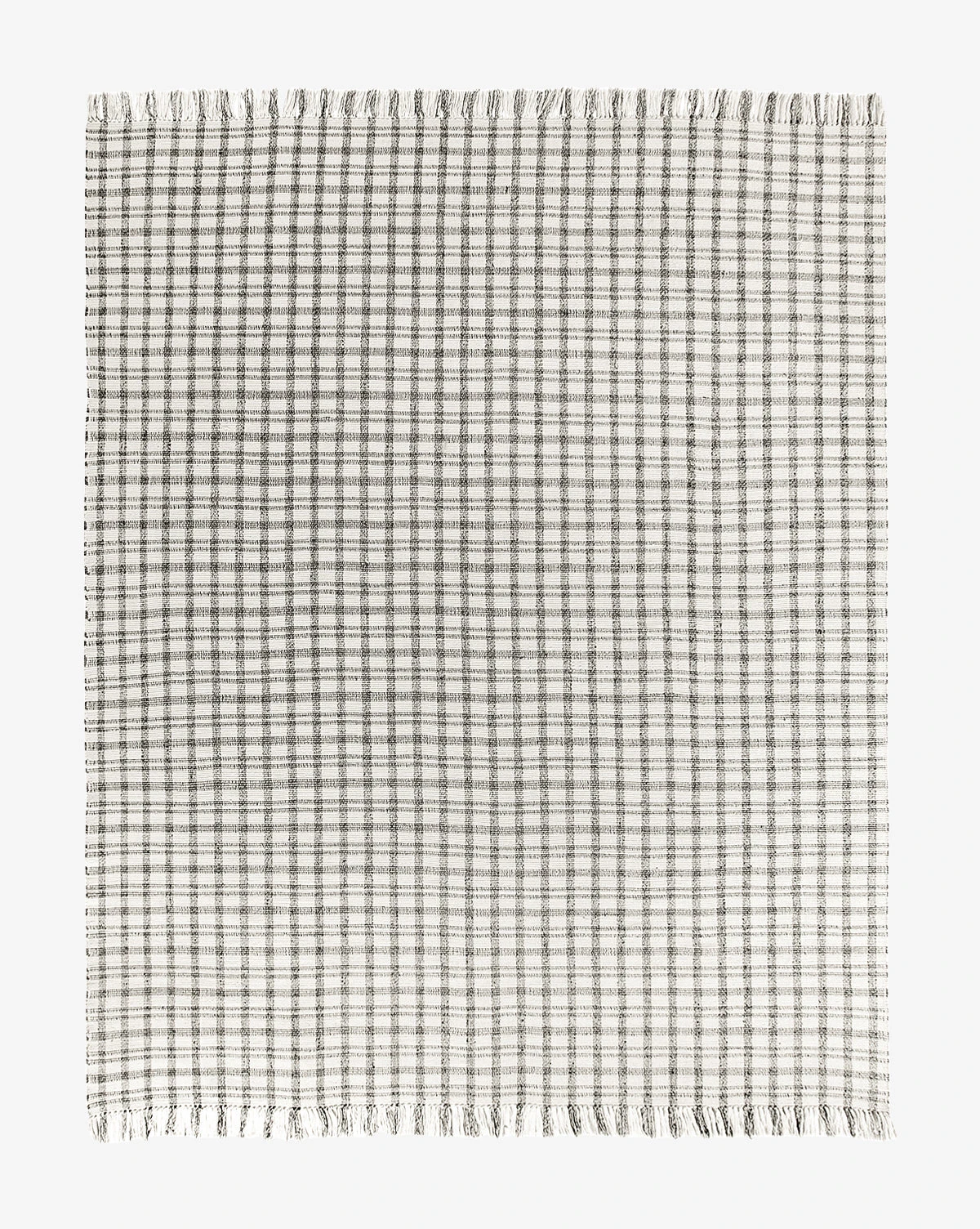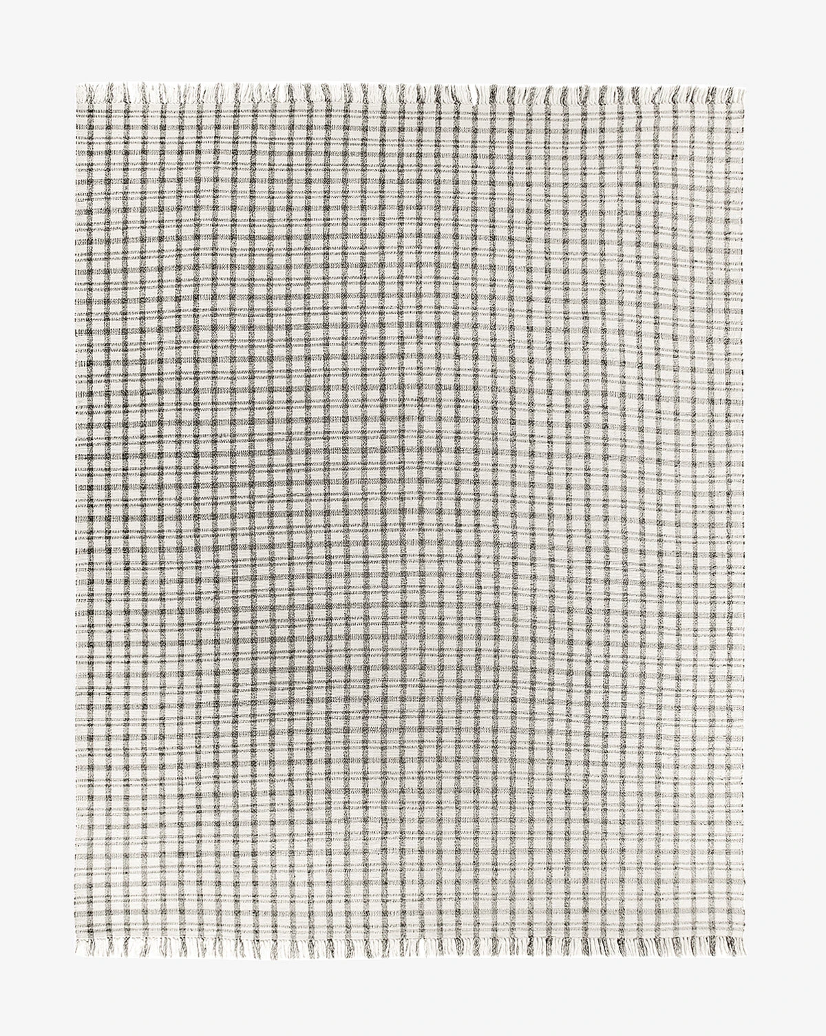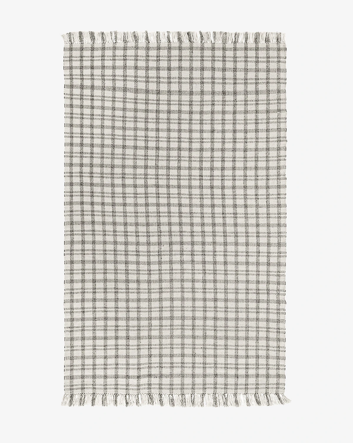 In cream and deep gray plaid, the Amherst Handwoven Indoor/Outdoor Rug uses a crisscross pattern and long, delicate fringe to give warmth and motion to your floors. Soft to the touch and loomed with recycled polyester, this rug has no pile and is easy to clean — perfect for high-traffic indoor or outdoor areas.Â