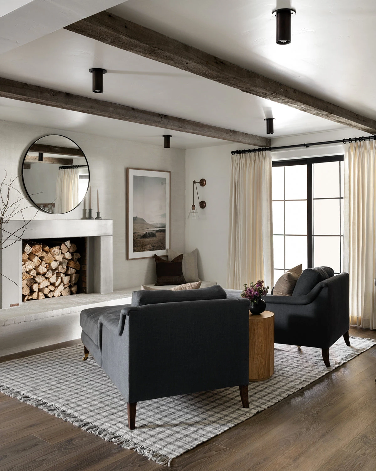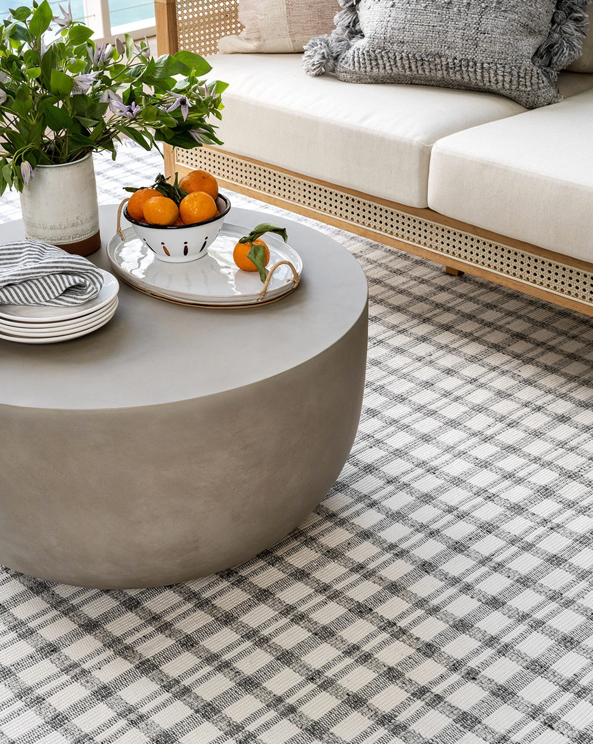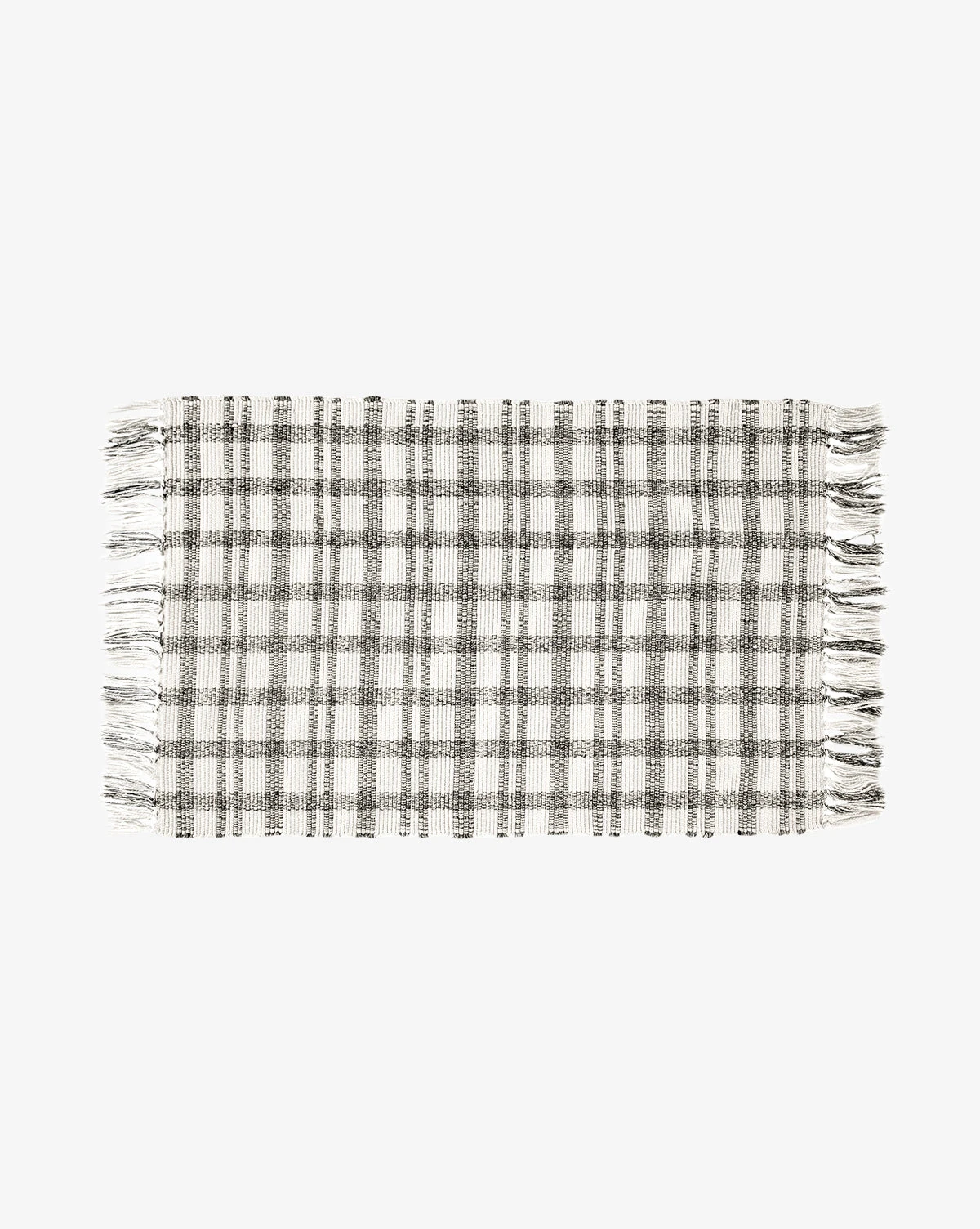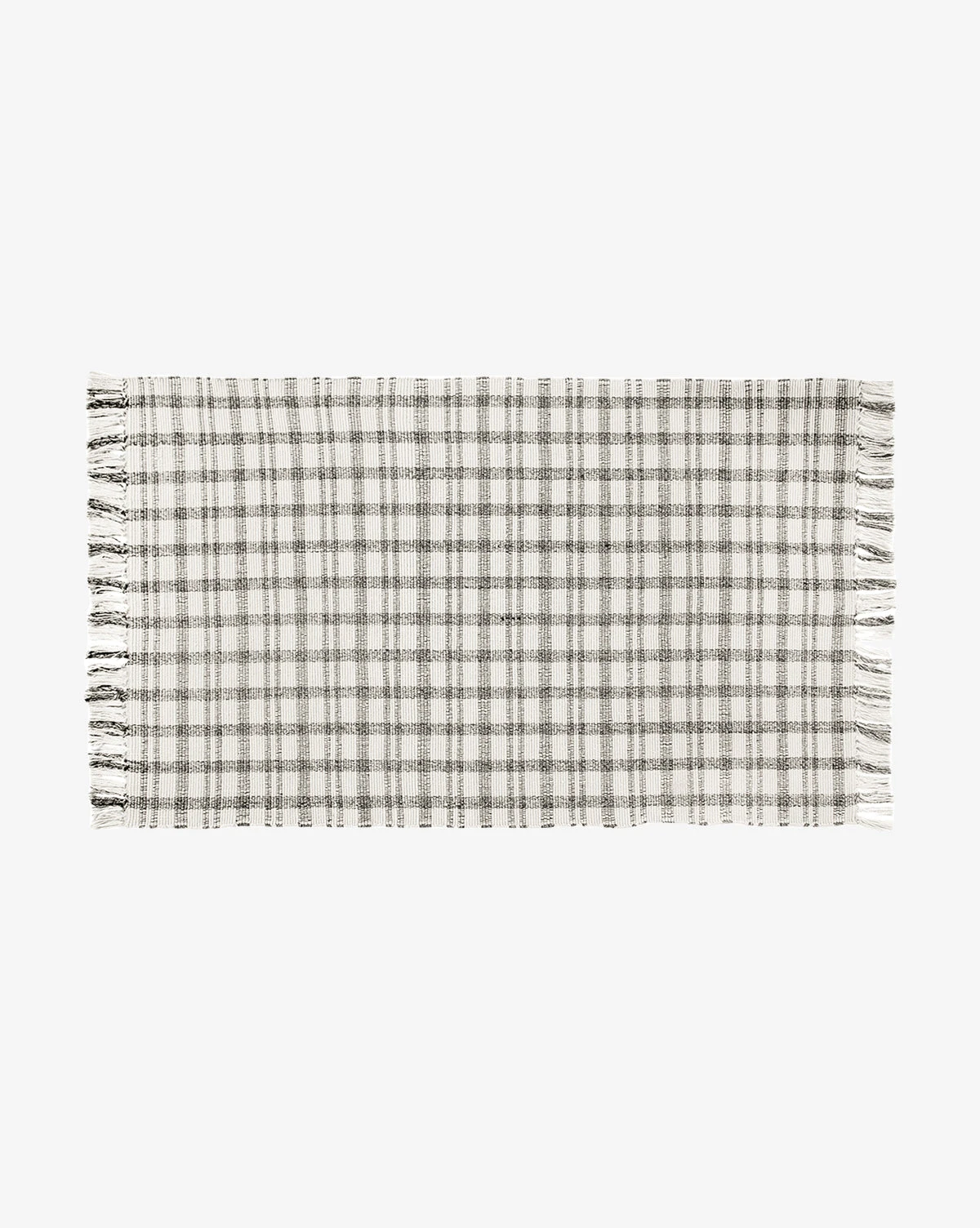 In cream and deep gray plaid, the Amherst Handwoven Indoor/Outdoor Rug uses a crisscross pattern and long, delicate fringe to give warmth and motion to your floors. Soft to the touch and loomed with recycled polyester, this rug has no pile and is easy to clean — perfect for high-traffic indoor or outdoor areas.Â