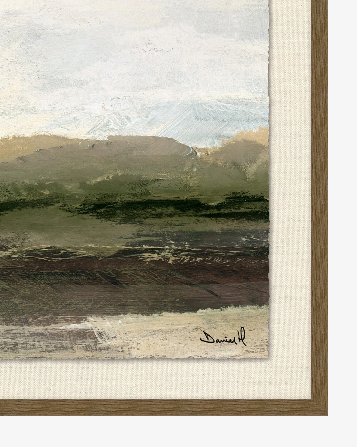 Giclee printed on hand-deckled paper for exquisite detailing, Among the Hills is intentional in its depiction of rolling hills. With plenty of negative space and layers of green and beige hues, its composition moves viewers through the piece with graceful brush strokes. Floated on a hand-wrapped fabric mat and produced with museum quality material, this piece is timeless and beautiful. Â