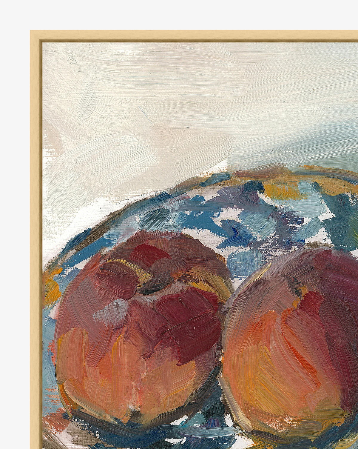With broad brushstrokes of pigmented hues, this Apples Still Life artwork showcases the shadows and textures of an everyday kitchen vignette. Its warm tones feel rich and inviting, welcoming the viewer into the piece through its celebration of simple scenes and ordinary moments. Printed in a large size, this artwork fills wall space with beauty.