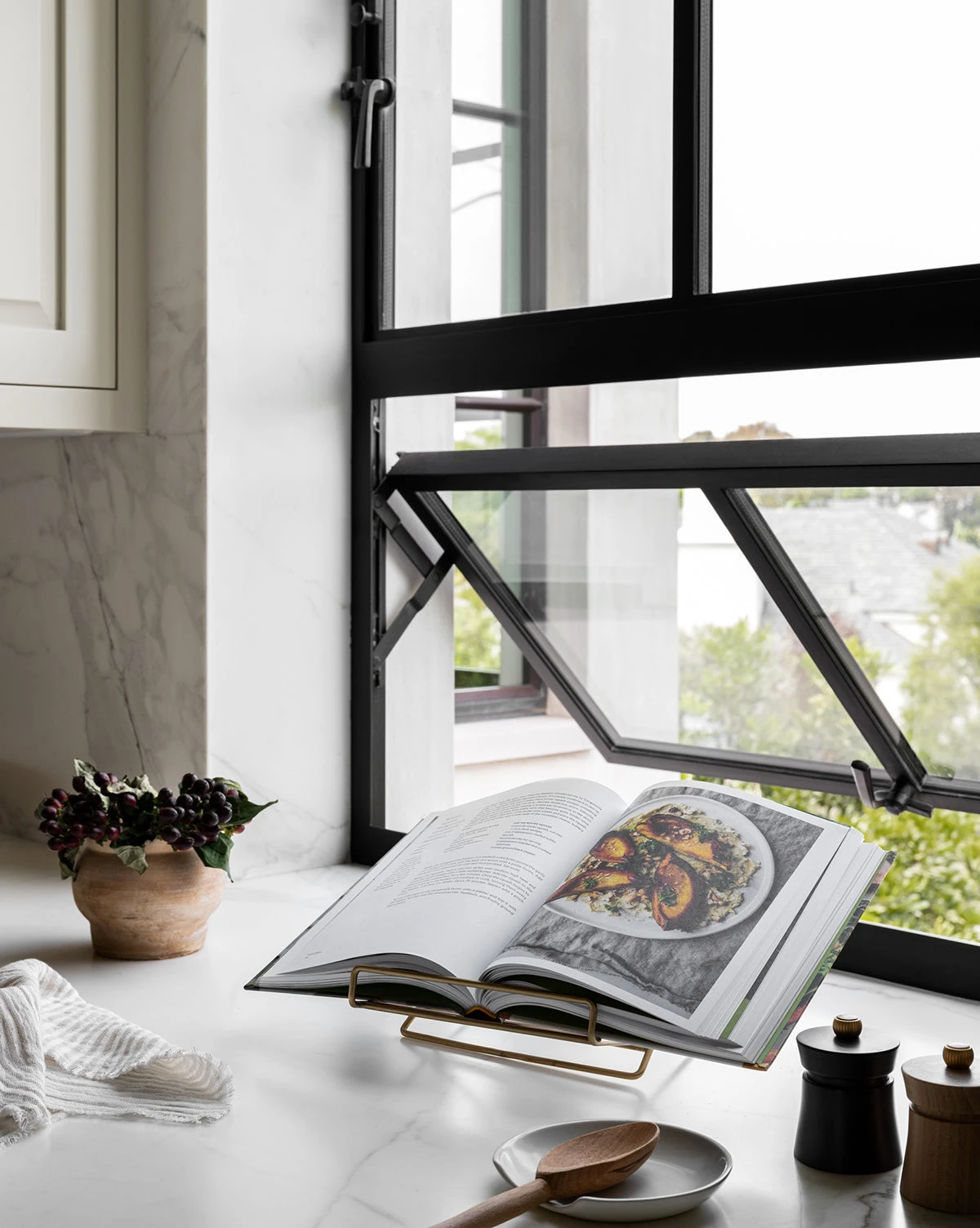 The unique shape of this modern Brass Cookbook Holder gives presence to countertops even when it isn’t holding a book. Its clean lines and slender metal silhouette are pronounced yet simple, adding both purpose and a refined style to your kitchen.