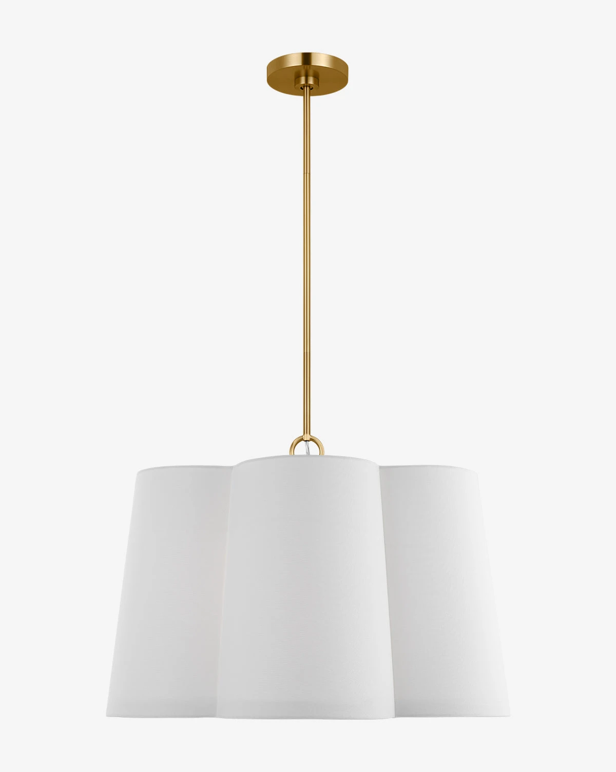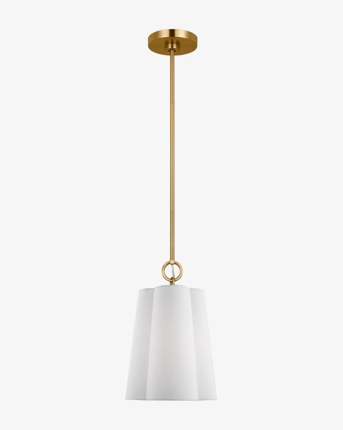 Elegant and classic, the Bronte Hanging Shade is crafted from white silk screen with a steel structure in a burnished brass finish. The scalloped shade creates an approachably nuanced design and brings warm light to any room.