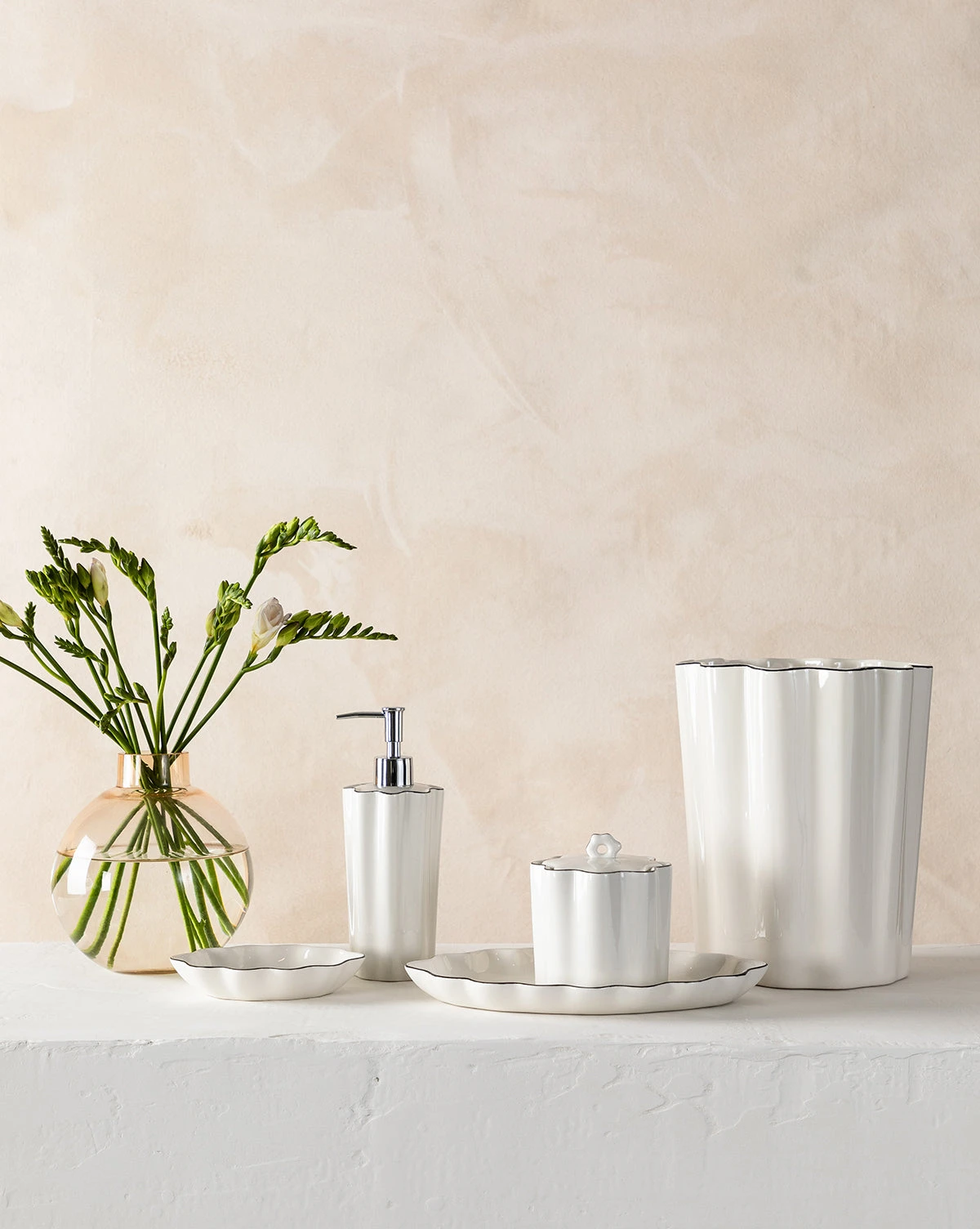 Made from porcelain, the Bryer Waste Bin has a charming and whimsical design. With the dark border on its scalloped edges, this waste bin brings refinement and elevated detail to your bathroom decor.