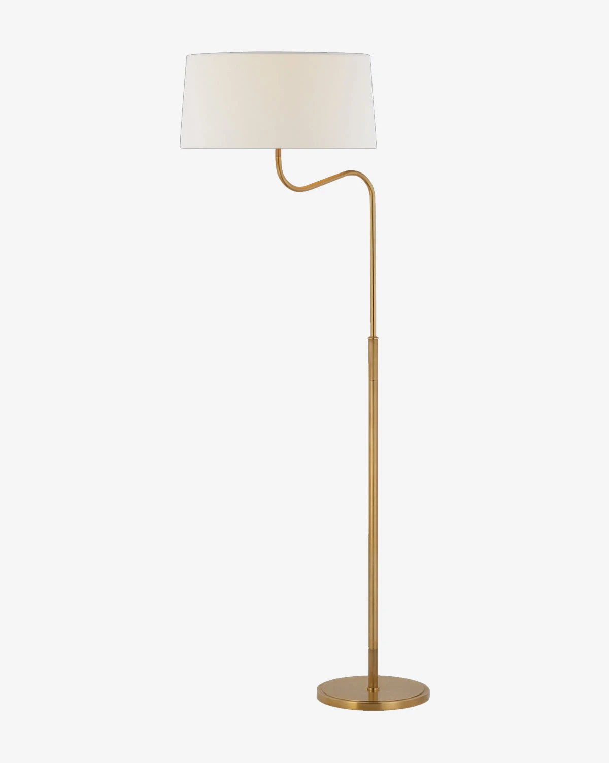 With a classic white linen shade to complement the uniquely curved arm, the Canto Large Adjustable Floor Lamp brings intrigue and refinement to your decor. In a hand-rubbed antique brass finish, the floor lamp is sleek and inviting.