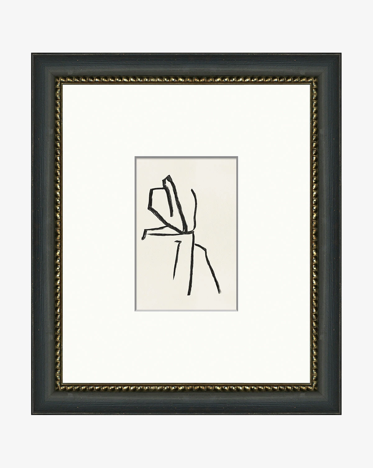 An abstract outline of a posed person, Contemplative Figure is composed of simple black brush strokes. Its composition is captivating, elevating the decor in your space. With a wood frame, the piece is presented with gallery-quality materials.