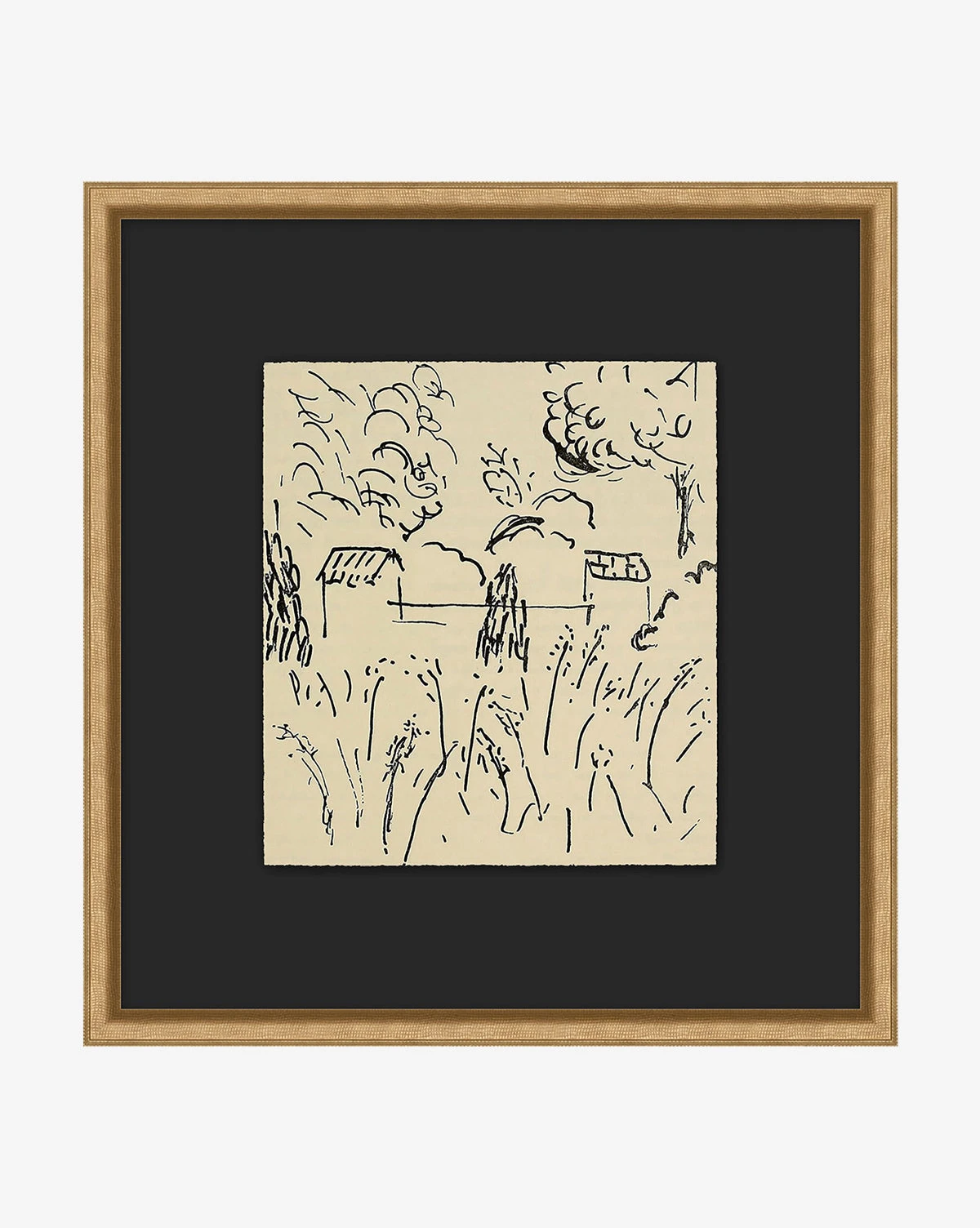 With the feel of a vintage illustration, Courtyard is simple yet captivating. The sketch depicts a plant-filled courtyard, that is warm and inviting in its spaciousness. Deckled and floated on a mat, the piece is framed by gold-finished wood. Â