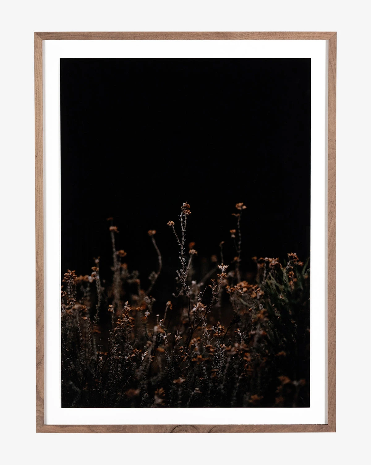 An intimate garden scene is superimposed onto a moody landscape in Flowers on a Black Background. Created by England-based photographer, Annie Spratt, the image is printed on top-quality photo paper and framed with walnut. Â