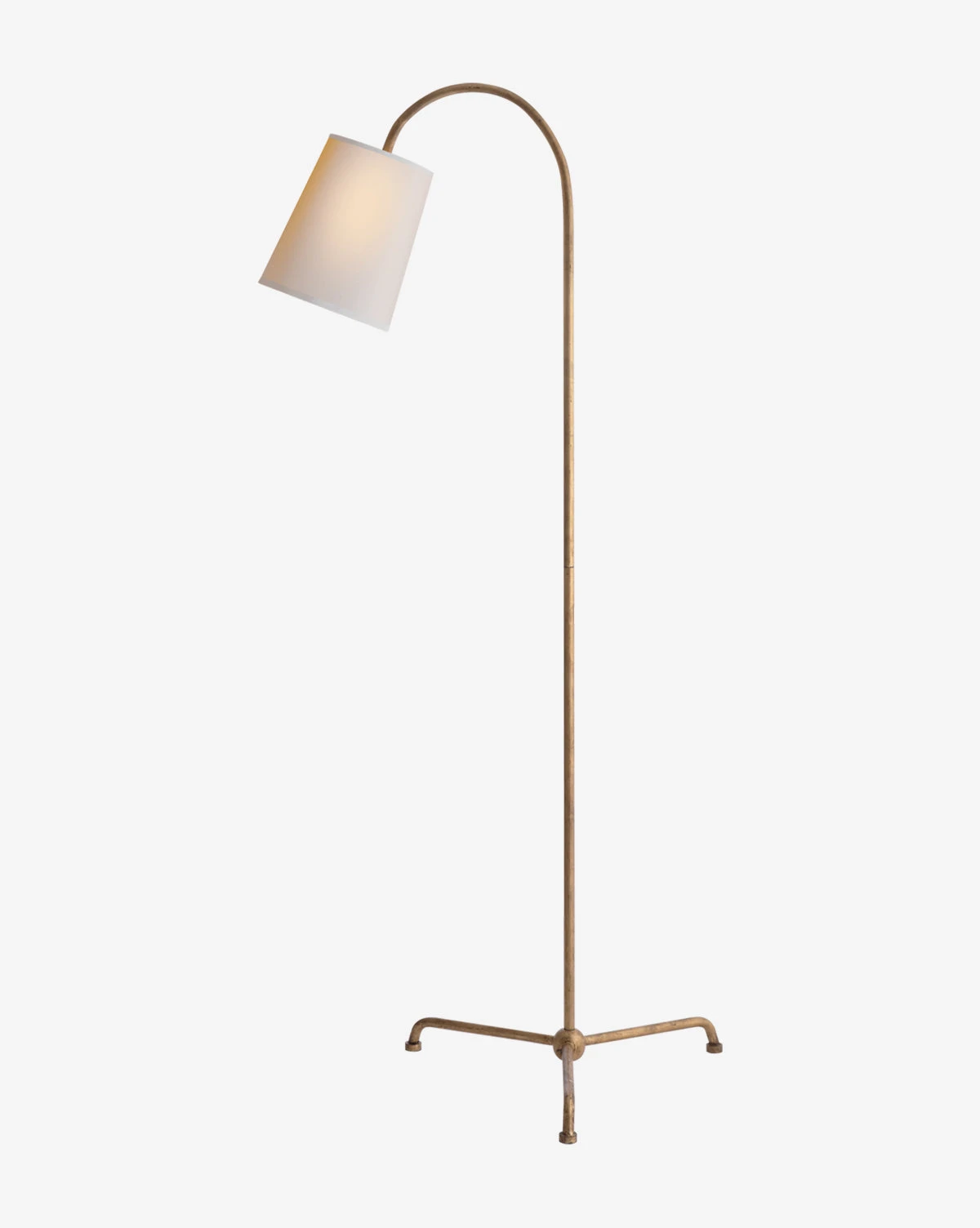 Defined by its curved arm and elegant simplicity, the Mia Floor Lamp offers a soft focal point in lighting designs everywhere from the office to the living room. In either a gilded iron, or aged iron finish, the lamp brings classic refinement to your home.