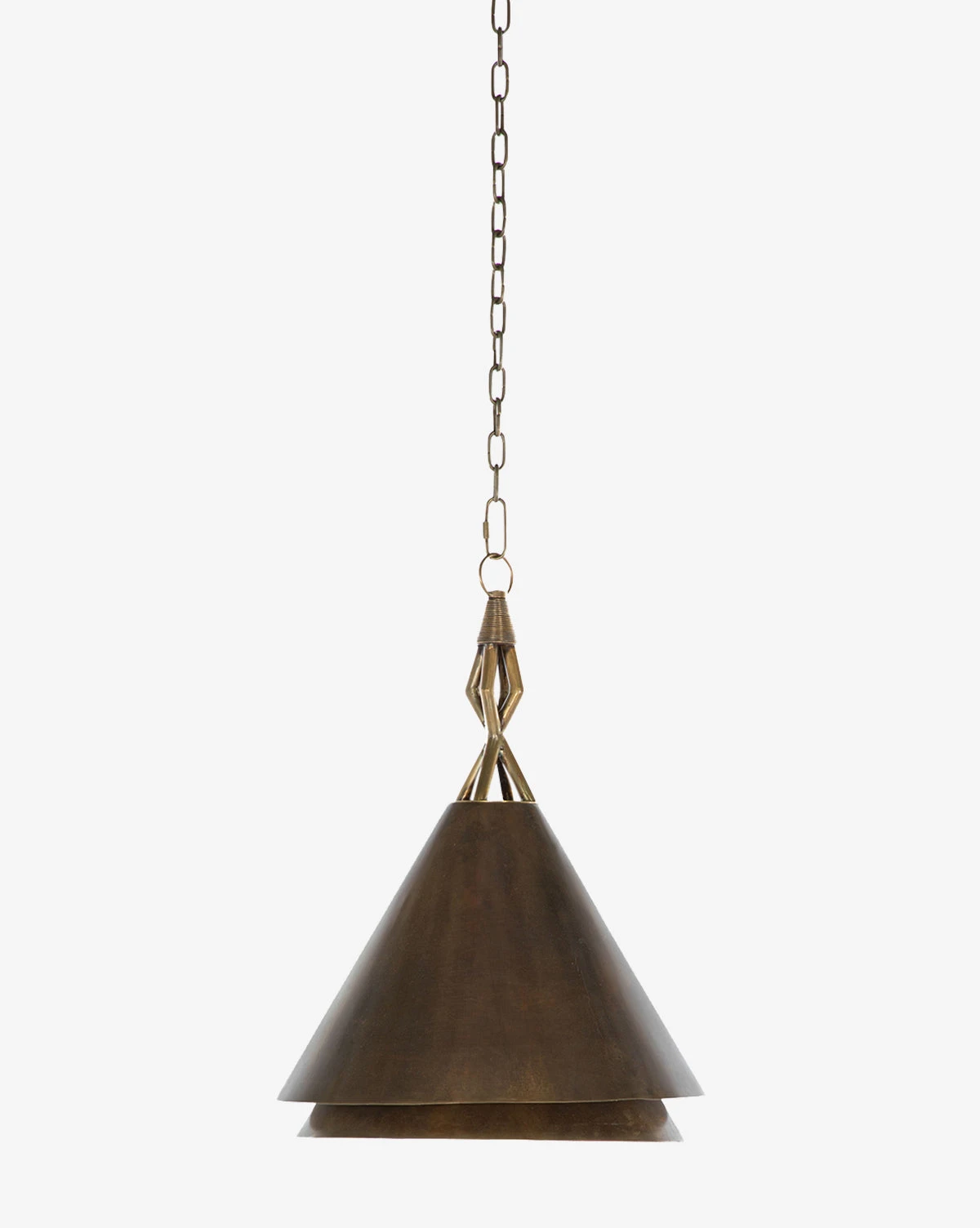In a striking form, the Mona Pendant brings both artful and industrial elements to your decor. A conical shade finished in antique light brass features two layers below the detailed chain and geometric finial, in a cohesive and warm palette.