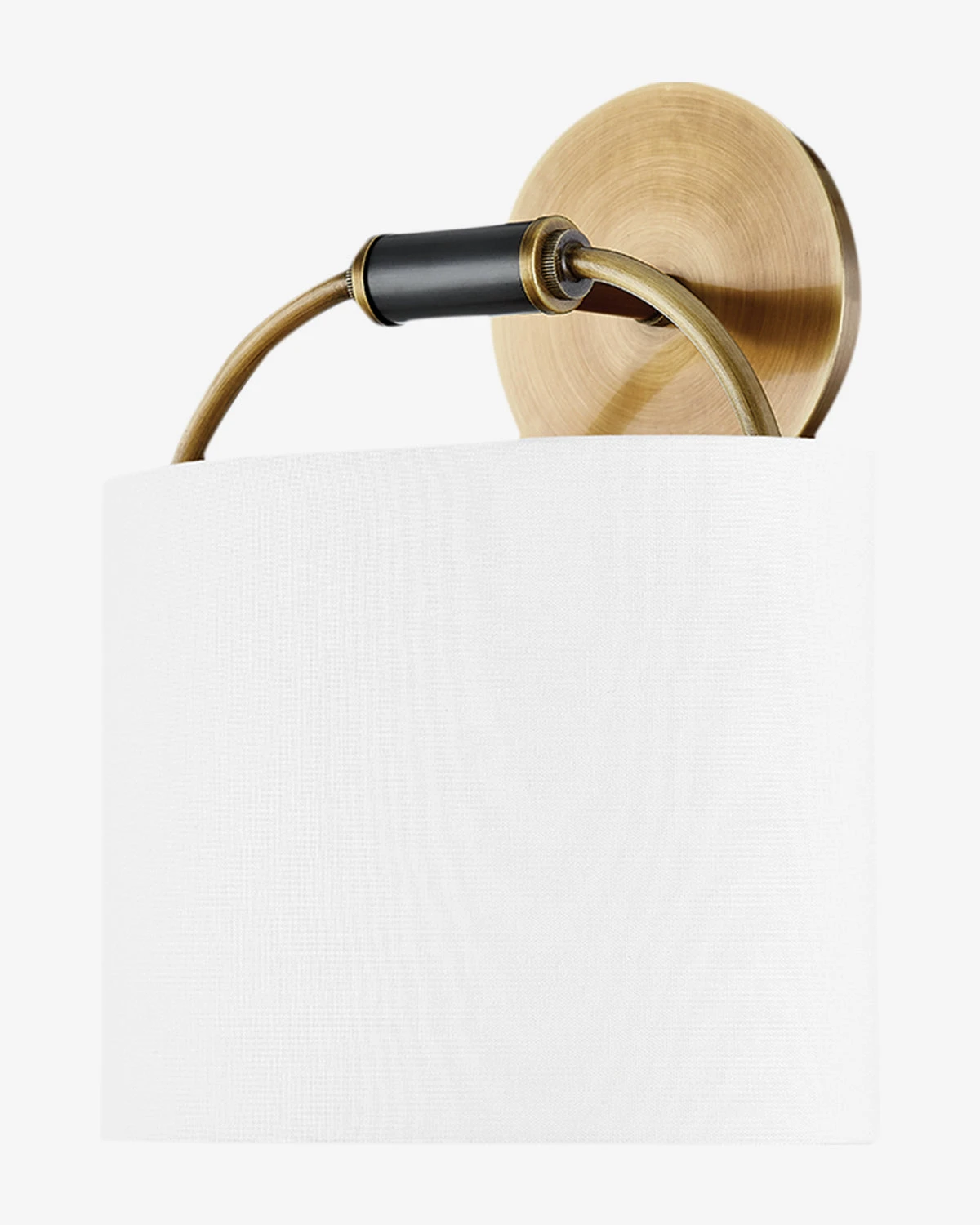 In an elegant design, the Pete Wall Sconce blends traditional materials with a contemporary feel. Its white linen shade is suspended by an exaggerated hook to complement its circular backplate. With a seamless mix of materials, this sconce brings warm light to any room.