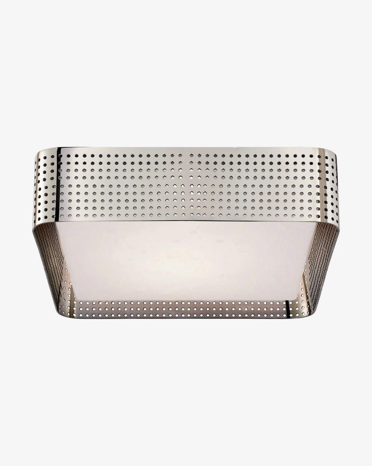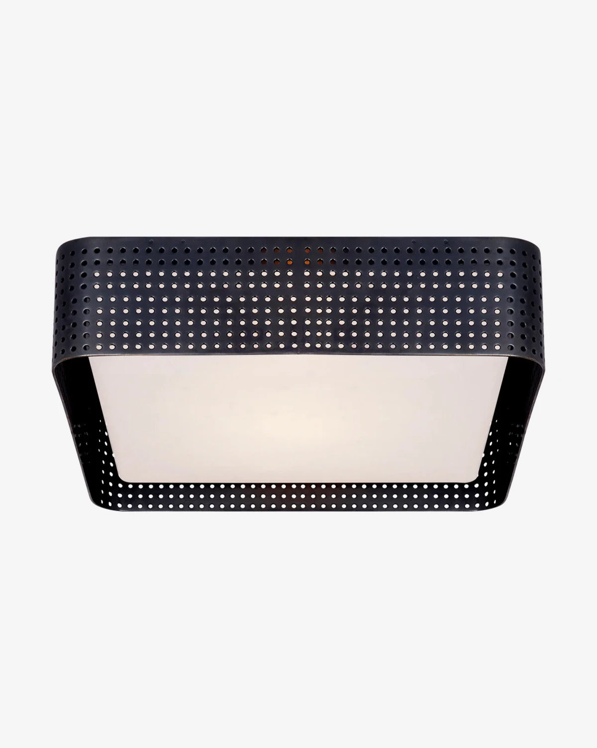 The Precision Flush Mount is an innovative take on classic ceiling lighting. Â Its clouded glass shade is thoughtfully contrasted with a uniformly perforated metal cage is that uniquely diffuses the light.