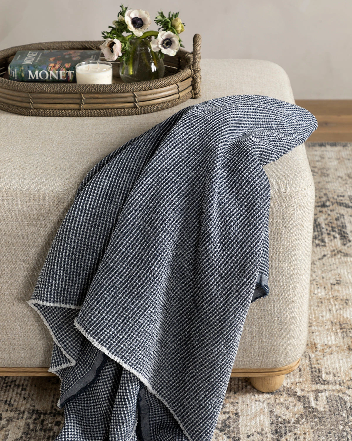 With a classic waffle weave, the Rebecca Throw is expertly made with cotton for lasting softness. Bringing texture and warmth, the throw’s deep navy color lends interest to textile layering and styling in any room in your home.
