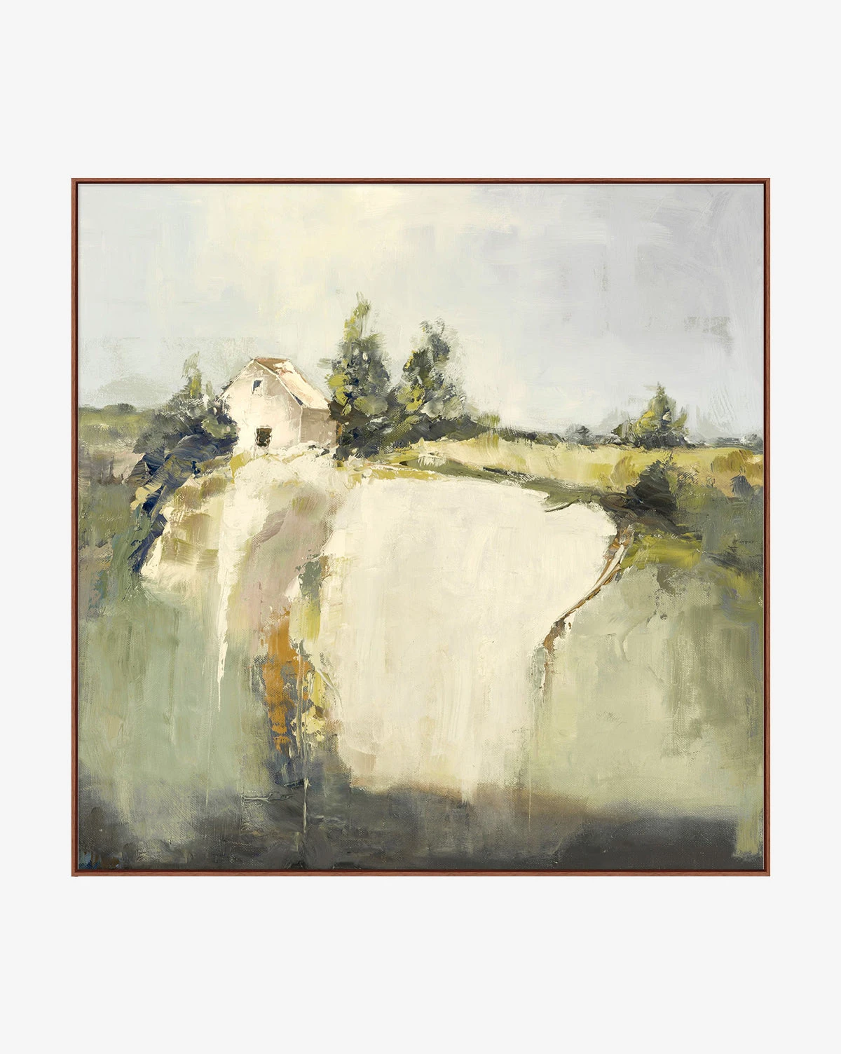 Whimsically romantic, Remote Countryside has a washed look that is complemented by a soft palette of greens and beige. Its composition directs the eye toward the small cottage perched on the hillside — a call to simplicity. Artist enhanced, Remote Countryside is framed in walnut wood for a museum-quality feel.