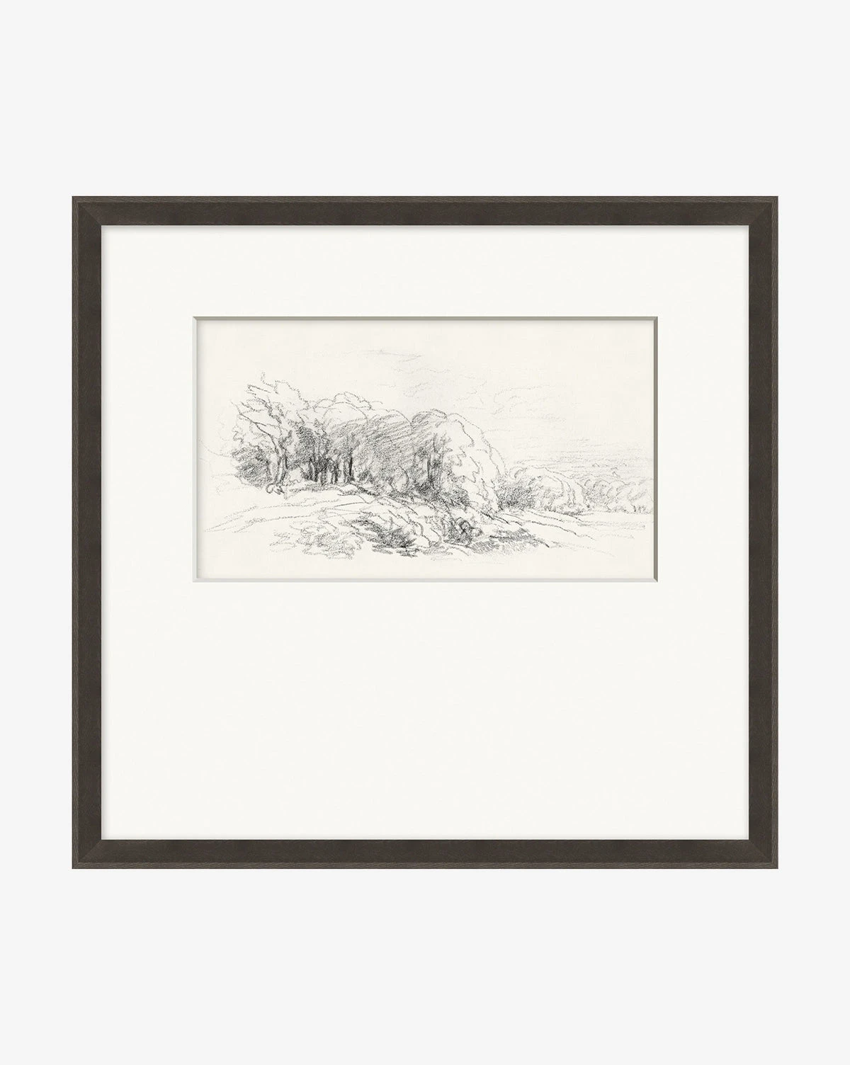 Sketched with expressive shading and lines, Sketch Landscape I has a warm and inviting feel. Its composition features a charming hillside scene with movement and detail. Framed in black woodgrain, the artwork has an elevated, museum-quality look. Â