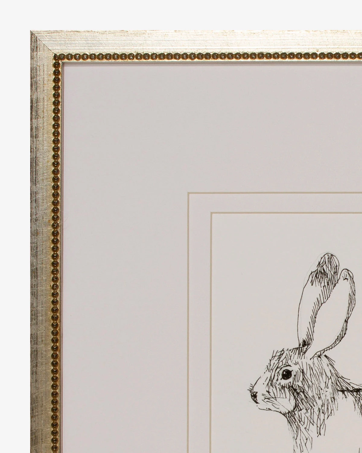 Subtle and imaginative, the Sketched Bunny I giclee print has a whimsical feel that nods to childhood fairytales. Mounted in a wood frame in a silver finish, this piece’s airy style and intricate linework bring detail to simplicity and give a refined yet playful tone to children’s rooms.